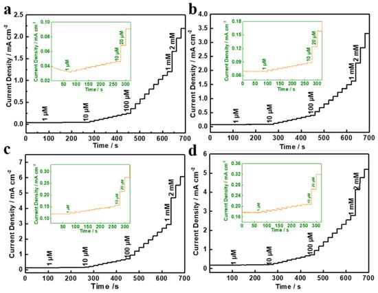 Figure 6 shows the amperometric responses of different samples on the successive addition of various concentrations of glucose from 1 μM to 2 mM in a 0.1 M NaOH solution at a working potential of 0.50 V (vs. Ag/AgCl). By comparison, it was clear that the Ag/NiCo2O4-NC samples delivered a quick response by reaching a steady current within 10 s, which suggested a high electrocatalytic activity and fast electron transfer for glucose sensing.