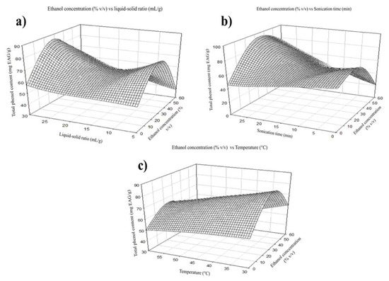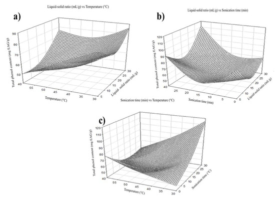 Effect of temperature, liquid-solid ratio, and sonication time on the extraction of total phenols. (a) Graphical of liquid-solid ratio vs. temperature, (b) liquid-solid ratio vs. sonication time and (c) sonication time vs. temperature.