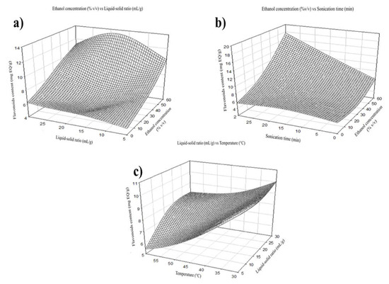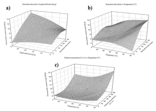 Effect of temperature, liquid-solid ratio, and sonication time on the extraction of flavonoids. (a) Graphical of sonication time vs. liquid-solid ratio, (b) sonication time vs. temperature, and (c) ethanol concentration vs. temperature.
