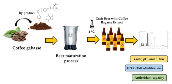 Beer is one of the world’s oldest and most consumed alcoholic beverages, ranking third in popularity after coffee and water [11]. The base ingredients of any beer are malt, hops (Humulus lupulus L.), yeast, and water. Beer comprises prenylated flavonoids, phenolic acids, simple phenols, hydroxycoumarins, flavones, proanthocyanidins, tannins, and aminophenol compounds [12,13,14], which come mainly from malt and, to a lesser extent from hops, with a percentage of 70 and 30%, respectively [11,12]. Among those compounds, phenolic compounds can contribute to beer characteristics such as color, taste, haze, astringency, colloidal, and foam stability [15]. However, these compounds are reduced due to the filtration and clarification processes, low-quality raw materials, as well as storage conditions. Therefore, the addition of phenolic compounds can improve the health properties of manufactured beer [12]. Nowadays, the beverage industry seeks to add fruits and raw materials rich in bioactive compounds. The addition of fruits in the beer not only adds new flavors but also increases the content of bioactive substances with antioxidant capacity. Various fruits and adjuncts have been added to beer, such as omija, mango, persimmon fruit, raspberry, and cranberry juice. Additionally, the use of agro-industrial by-products, such as orange peels and eggplant peels, in the production of beer has also been explored [16]. Nevertheless, no work has been found regarding the addition of coffee bean bagasse to beer. Bioactive compounds in the coffee bean bagasse extracts could modify the physicochemical parameters, the polyphenols content, and the antioxidant activity in beers. Thus, the extracts of coffee bean bagasse could be an alternative to increase the profile and concentration of bioactive compounds in craft beer.