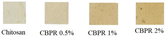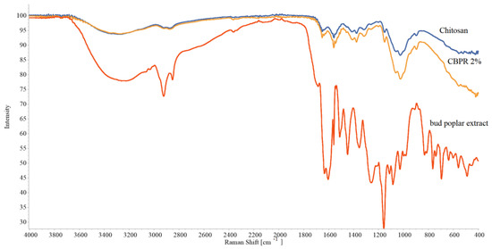 The chitosan and CBPR 2% films’ spectra had almost the same patterns, and no shifts of chitosan-typical absorption bands could be observed, indicating the absence of interactions between propolis and chitosan. In CBPR 2%, spectrum absorption bands of propolis could not be observed, possibly due to the low concentration of bud poplar extract in the film.