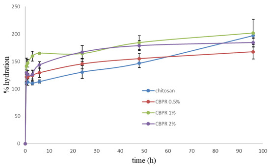 All films showed a good and fast hydration capacity (Figure 4). After 30 min, hydration was in the range of 120–140%. The presence of bud poplar resin did not decrease the water sorption capability; rather, the best hydration percentage values were obtained with CBPR 1% and CBPR 2% films.