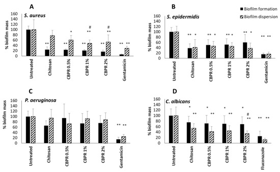 Effect of chitosan and CBPR films on the formation and dispersion of S. aureus (A), S. epidermidis (B), P. aeruginosa (C), and C. albicans biofilm (D). The data are expressed as a mean ± SD of the percentage of the biofilm mass (n = 12). The statistical analysis was performed with two-tailed Student’s t-test. * p ≤ 0.05, ** p ≤ 0.01 (chitosan- and CBPR-film-treated cells vs. untreated cells), # p ≤ 0.05 (CBPR-film-treated cells vs. chitosan-treated cells).