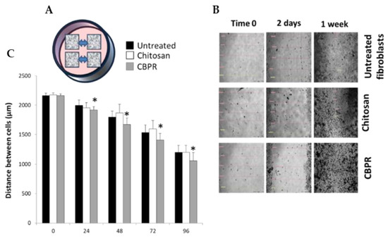 Regenerative effect of chitosan films on human dermal fibroblasts. The regenerative activity assay was performed in Micro-Insert 4-well dishes (A), the distances between the frames was monitored under the microscope (20× magnification) for 7 days and photos were taken (B). The distances between the frames were recorded and the results are expressed as mean ± SD of the measurements by microscope (n = 6) carried out in two individual experiments (C). the statistical analysis was performed with a two-tailed Student’s t-test. * p ≤ 0.05 (chitosan- and CBPRfilm-treated cells vs. untreated cells).