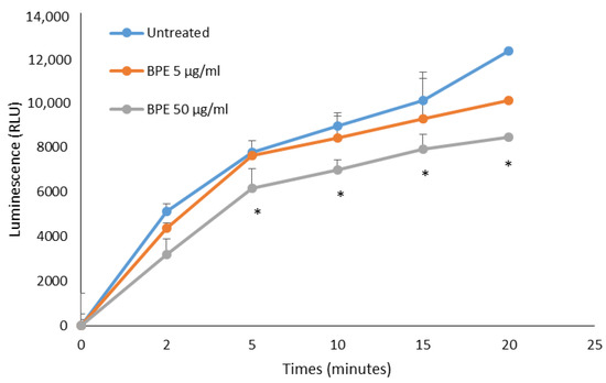 In vitro neutralization of ROS produced by human PMA-stimulated PMN. Results are expressed in relative luminescence units (RLU). Data represent the mean of three independent experiment performed in triplicate for BPE at two different concentrations. The statistical analysis was performed with a two-tailed Student’s t-test. * p < 0.05 (BPE-treated cells vs. untreated cells).