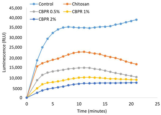 As observed with the DPPH test, chitosan film is able to reduce the production of ROS. However, CBPR films decreased the ROS concentration in BPE in a dose-dependent manner (Figure 14).