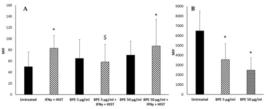 Effect of BPE on intracellular ROS production of HuDe (A) and NCTC 2544 (B) cells. The experiment was performed in quadruplicate for each substance. The statistical analysis was performed with a two-tailed Student’s t-test. * p < 0.05 (BPE-treated cells vs. untreated cells); $ p < 0.05 (BPE-treated cells vs. IFNγ+-HIST-treated cells).