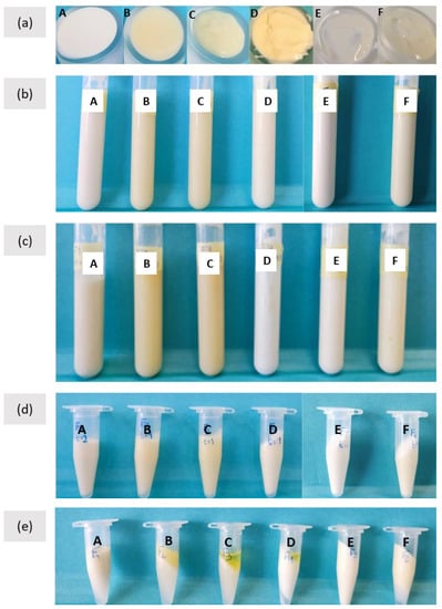 Formulations A, B, C, D, E, F: (a) freshly prepared formulations (t = 0); (b) after 1 day; (c) after 60 days; centrifugation test for 1 day of storage (d) and for 60 days of storage (e).