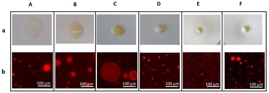 FucoPol-based formulations (A, B, C) and formulations based on stearic acid (D), Sepigel® (E), and stearic/Sepigel® (F): (a) Emulsion determination test by filter paper wetting; (b) visualization of oil droplets stained with Nile Blue A, under the optical microscope.