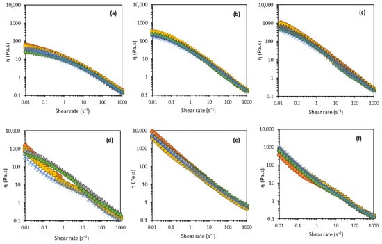 Flow curves for the prepared formulations: A (a), B (b), C (c), D (d), E (e), and F (f) during the storage time; t = 1 day (orange), t = 3 days (yellow), t = 7 days (gray), t = 30 days (green), and t = 60 days (blue).