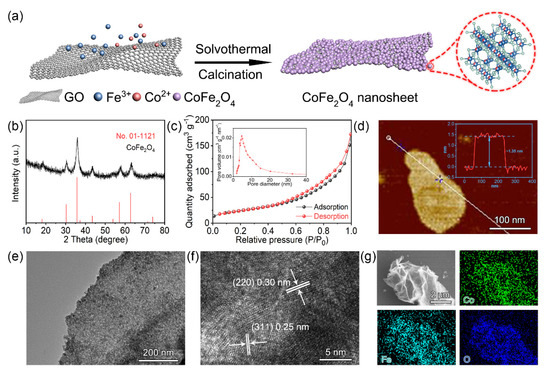 (a) Schematic illustration of the preparation processes of CoFe2O4 nanosheets. Phase characterization of the prepared CoFe2O4: (b) XRD; (c) N2 adsorption–desorption isotherm, inset: pore size distribution; (d) AFM image and the corresponding height profiles (inset); (e) TEM image; (f) HRTEM image; (g) areal elemental mapping images.