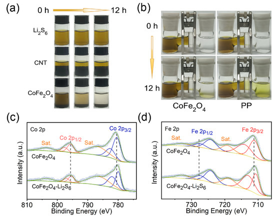 (a) Visual adsorption experiment; (b) lithium polysulfide penetration test; (c) Co 2p; and (d) Fe 2p XPS spectra of CoFe2O4 sample before and after Li2S6 adsorption. The curve of the grey circle connection is the data point of the original data, and the curve fitted by the XPS analysis software is green. The yellow line is the baseline. For Figure (c): the orange curve represents the peak of the metal cobalt salt, and the red and blue curves represent the peak position of the Co 2P orbital. For Figure (d): the orange curve represents the peak of the metallic iron salt, and the red and blue curves represent the peak position of the 2P orbit of Fe.