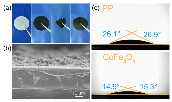 Optical images of the separator before and after CoFe2O4 modification are displayed in Figure 3a, where the material is uniformly covered on the surface of the commercial Celgard separator. After folding and re-expanding the modified separator multiple times, the coating on the surface remained intact, demonstrating favorable mechanical stability. The thinnest coating thickness could be achieved without increasing the cell volume to fully increase the diffusion rate of lithium ions. As shown in Figure 3b, the cross-sectional SEM image reveals that the CoFe2O4 coating on the separator was roughly 10 μm thick, lower than many previous reports (Table S1), fully meeting the coating-thickness criteria of the battery [43,44,45,46,47,48,49,50]. Furthermore, the electrolyte and coating should have a high degree of affinity for electrolyte penetration and ion diffusion. The coating materials with low levels of affinity are ineffective. Therefore, the contact angle test with the lithium–sulfur electrolyte was performed (Figure 3c). The CoFe2O4-modified separator outperformed the commercial separator in terms of contact angle. The contact angle size of the former was around 26°, whilst the latter was only about 15°. This indicated that the prepared coating not only did not hinder, but rather accelerated the diffusion of the electrolyte, which would be beneficial to the cell dynamics.