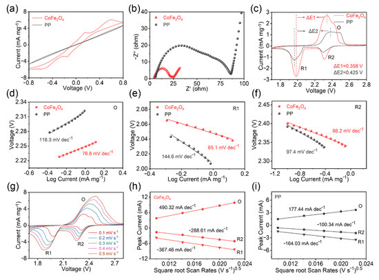 (a) CV and (b) EIS of symmetric cells with Li2S6 additive; (c) CV curves of sulfur cathode with different separators; (d–f) the corresponding Tafel plots and fitted slope values of oxidation and reduction peaks; (g) CV curves with CoFe2O4-modified separator at various scan rates; (h,i) plots of the CV peak current versus the square root of the scan rates of lithium–sulfur batteries based on pure and CoFe2O4-modified separators. For Figure (h): the red circle represents the data points corresponding to the oxidation peak (O) in Figure (g), and the triangle and pentagon correspond to the data points of the first reduction peak (R1) and the second reduction peak (R2), respectively. For Figure (i): Figure (i) is a graph between the CV peak current of the lithium-sulfur battery based on the PP separator and the square root of the scan rate, so the upper left corner is marked with PP. The gray circle represents the data points corresponding to the oxidation peak (O) in Figure S4, and the triangle and pentagon correspond to the data points of the first reduction peak (R1) and the second reduction peak (R2), respectively.