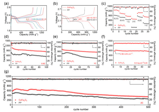 (a) Galvanostatic discharge–charge profiles of lithium–sulfur batteries with a CoFe2O4-modified separator at different rates; (b) comparison of discharge–charge curves at 0.2 C; (c) rate performance; (d,e,g) cyclic stability tests at 0.5, 1, and 2 C; (f) high load performance of the CoFe2O4-based battery. For Figure (g): 2C in the lower right corner means that both the CoFe2O4-modified separator and the PP separator assembled battery are tested for cycle stability at 2C. The two beating data points in the upper right corner are normal phenomena that occur during testing. The lithium-sulfur battery assembled without a modified separator has undergone hundreds of charge and discharge processes inside the battery after a long cycle. The consequences of the shuttle effect in this process will lead to unstable charging and discharging, so the data points corresponding to the Coulombic effect fluctuate.