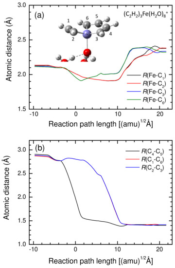 Key atomic distances for (a) Fe-C and (b) C-C along the acetylene cyclotrimerization reaction catalyzed by the Fe+(H2O)8 cluster plotted as a function of the reaction path length defined in Figure 1.