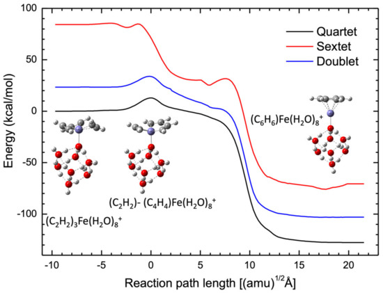 As mentioned above, the quartet state is the lowest spin state in this reaction. In order to confirm it, we investigated the effect of other spin states, namely doublet and sextet, because these states are energetically close to the quartet spin state [23,24,28]. Figure 3 shows the potential energy profiles for the sextet and doublet spin states along the IRC structures calculated for the quartet spin state. No crossing points can be observed for these three potential energy curves, indicating that acetylene cyclotrimerization catalyzed by the Fe+(H2O)8 cluster occurs exclusively on the quartet potential energy surface.
