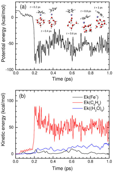 Finally, we discuss the dynamical aspects of the acetylene cyclotrimerization reaction catalyzed by the Fe+(H2O)n complex. The dynamical aspect should be carefully examined because non-IRC dynamics frequently occur in complicated reaction systems [48,49]. In this case, the reaction product cannot be identified only from the static IRC calculations. It is possible that a large reaction exothermicity can provide additional kinetic energy to the atoms in the reaction system, leading to a deviation from the IRC pathway. In addition, it is important to understand the energy transfer dynamics because the acetylene cyclotrimerization process has a large exothermicity associated with stable benzene formation. Motivated by this, we performed molecular dynamics calculations starting from the transition state structure with a Born–Oppenheimer molecular dynamics (BOMD) keyword implemented in the Gaussian09 program [40], where energy gradients were employed to solve the equations of motion of the nucleus. The BOMD calculations were only performed for the Fe+(H2O)8 cluster. We added a total kinetic energy of 1 kcal/mol for the atoms in the Fe+(C2H2)3 moiety. If the trajectory moved toward the (C2H2)3-Fe+(H2O)8 reactant complex region, the calculation was terminated, whereas if the trajectory moved toward the benzene formation direction, the calculation was performed up to t = 1 ps. The time increment was set at Δt = 0.5 fs. Since BOMD calculations generally require a large computational time, even at the B3LYP/def2-SVPP level, we only calculated six trajectories showing benzene formation in this study. Here, it is worth noting that the dissociation of benzene from the Fe+(H2O)8 cluster was not observed in all the six trajectories (see below). A typical example is presented in Figure 6, where the potential energy is plotted as a function of simulation time in Figure 6a, and the kinetic energies for the C6H6, Fe+, and (H2O)8 moieties are plotted in Figure 6b. In this trajectory, a benzene molecule is formed around t ≈ 0.2 ps. Subsequently, a large amount of exothermic energy was distributed in the vibrational energy of benzene. We can also observe the energy transfer from the benzene vibration to the water cluster. At t = 1 ps, approximately 20 kcal/mol of energy was transferred to the atomic kinetic energy (vibrational energy) of the (H2O)8 cluster, leading to the breakage of a few hydrogen bonds. As mentioned previously, we did not observe the dissociation of benzene from the cluster within 1 ps of simulation time, presumably due to the large binding energy of ~50 kcal/mol between C6H6 and Fe+(H2O)8 (see Figure 4). The results for the other five trajectories were found to be very similar, as shown in Figure S6 of the supplementary material.