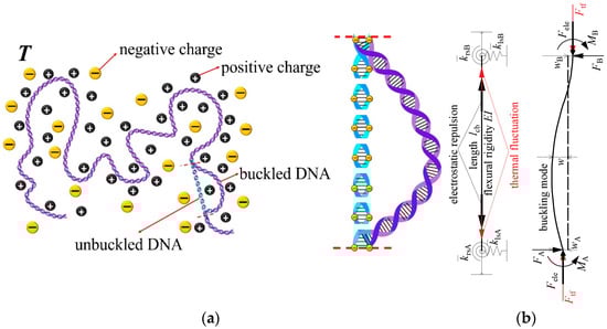 Biological shape is revealing of the physical forces acting on it [36,37], as DNA conformation does. The negatively charged DNA is in a shape caused by the coupled effects of internal electrostatic repulsion, thermal fluctuations, and external mechanical constraints. When the environment fluctuates, these effects also change, resulting in shifts between different DNA states, which is displayed as a transition between DNA straight or bending shapes. This change between different shapes is similar to the change in the deformation states of a buckled elastic rod under axial compression [38]. Therefore, the buckling model of the Euler beam can be conveniently and effectively used to study DNA.