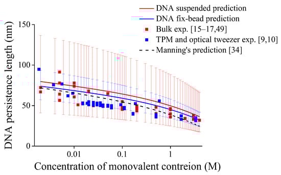 Another feature reflected in Figure 2 is that the DNA persistence length for DNA with fix-bead constraint is smaller than that of DNA suspended in solution. The previous statistical studies show that the mechanical constraint effects have close relation with the influence of constraint on DNA entropy [23,53]. While in Figure 2, the lower effective length factor indicates that the constraint of fix-bead is stronger than that of DNA suspended in solution, and the stronger constraint may restrict the number of possible DNA conformations, leading to lower DNA entropy and larger extension [21], which means more flexible DNA with smaller persistence length [14,21,25]. In addition, in Figure 2, the narrower distribution in the experimental results of DNA with fix-bead constraint and shorter error bars in the present predictions may also reflect a fewer number of possible DNA conformations.