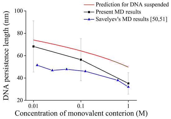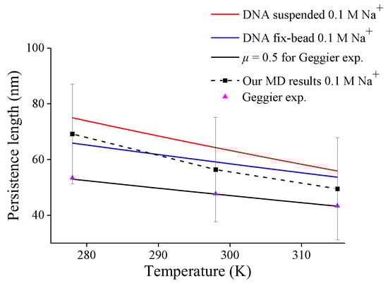 The last to be discussed is that DNA persistence lengths by MD simulation are then theoretical predictions as shown in Figure 4 and Figure 6. The fitted parameters used in the prediction are based on experimental results for long DNA chains with tens of kbp contour length, whereas shorter DNA chains are used in present and reported MD simulations [50,51]. While it has been reported that shorter DNA contour length leads to smaller persistence length [21,25,44,61].