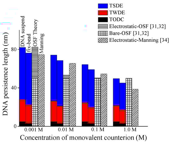 Figure 4 shows the respective contributions of three additive terms in Equation (7) to DNA persistence length under different ionic concentrations by three colors in the histogram, and these results are also compared with the predictions by the additive OSF model [31,32] and multiplicative Manning’s model [34]. The first term only includes the effective length factor μ and buckling length lcb related to constraints, so it can be called “term only depending on constraint (TODC)”; the second term is changed mildly with environmental conditions due to the square root of Fele/kBT, so the second term is called “term weakly depending on environment (TWDE)”; the third term is changed obviously with environmental conditions, so it is called “term strongly depending on environment (TSDE)”.