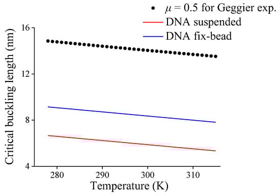 First, based on the clamp-clamp end-constraint of DNA in Geggier’s experiment, the effective length factor μ = 0.5 and temperature-dependent DNA persistence length obtained from Geggier’s empirical expression are substituted into Equation (6) to obtain the critical buckling length lcb of DNA fragment with temperature, and the prediction is shown as a black dot in Figure 5. Obviously, the critical buckling length decreases approximately linearly with the increasing temperature, so a linear fit for critical buckling length with temperature can be expressed as
