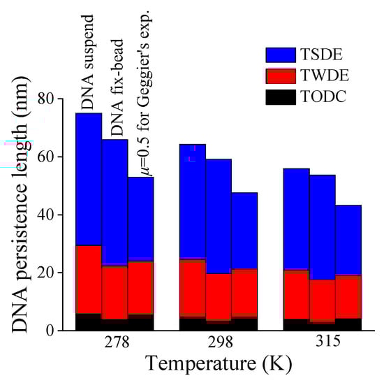 Next, the changes of three additive terms in Equation (7) varying with temperature are also shown in Figure 7. Obviously, the TSDE dominates the temperature dependence of DNA persistence length, with a dramatic descending trend, especially for DNA suspended in solution.