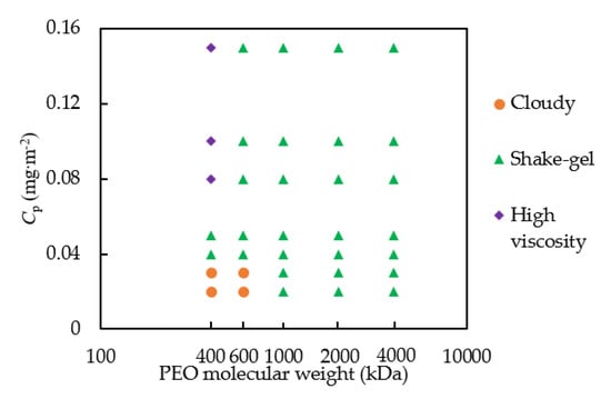 For these PEO polymers with different molecular weights, all the suspensions can form shake-gels under specific conditions. However, we found that suspensions consisting of 400 kDa PEO can produce cloudy, shake-gel, and high viscosity sol states. Meanwhile, suspensions consisting of 600 kDa PEO have a larger Cp area of shake-gel than that of the 400 kDa case, and the high viscosity sol state disappears. When the molecular weights of PEO were higher than 1000 kDa, the suspensions can form shake-gels under all the examined conditions.