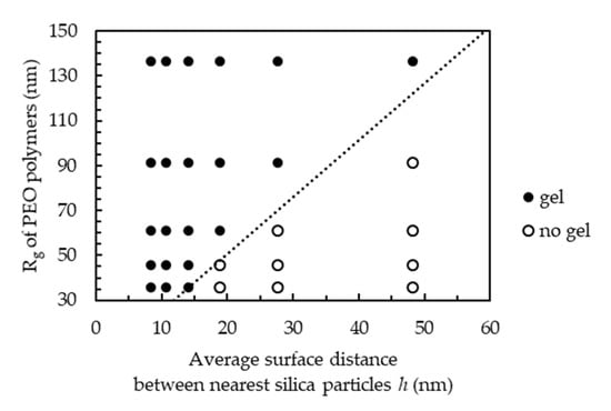 The states diagram in terms of Rg and h is shown in Figure 3, where the experimental data were taken at Cp = 0.04 mg∙m−2 because stable shake-gels can more easily form at this Cp, as described above. We can confirm that both the increase in Rg of the polymers and the decrease in h can promote the gelation of silica-PEO suspensions. The borderline between gel and non-gel states seems to be a linear line in which the Rg is about 2.5 times the distance of h. Our previous results demonstrated that Cp= 0.04 mg/m2 is the best Cp condition for shake-gel formation at the fixed conditions of pH, silica concentration, and PEO molecular weight. Even under the best Cp condition, shake-gels do not form when Rg is below 2.5 h.