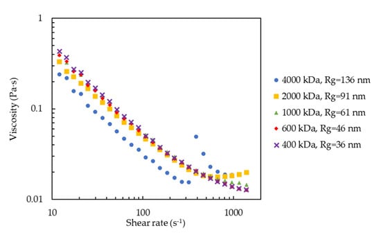 The viscosity of silica-PEO suspensions against shear rate at Cp = 0.04 mg∙m−2. The silica concentration was fixed to 10 wt% (h = 28 nm). The different symbols stand for different PEO molecular weights. In this condition, only the suspension with 2000 kDa and 4000 kDa PEO showed shear-thickening, meaning that they gelled. These results agreed with those in Figure 3, showing that the suspensions with Rg above 91 nm gelled at h = 28 nm.