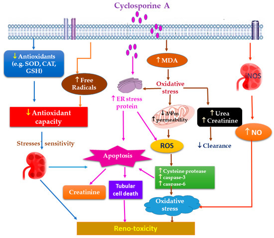 Cyclosporine A (CA), a cyclic peptide consisting of eleven amino acids, is purified from Topocladium inflatum fungus. CA is a potent immuno-suppressive agent that is commonly utilized to prohibit transplanted-organ rejection [7]. In solid-organ transplantation, CA significantly improves long-term survival rates [8]. Moreover, CA is utilized to manage varied autoimmune disorders, such as rheumatoid arthritis, psoriasis, and nephritic syndrome, as well as dermatological disorders [9]. However, CA has a narrow therapeutic index and its metabolism is performed by hepatic cytochrome (CYP450 3A 4/5) [10]. Nephrotoxicity is one of the serious adverse effects that limit the therapeutic uses of CA. Several reports have discussed the mechanisms by which CA induces nephrotoxicity [11,12]. The CA-nephrotoxicity-involved mechanism has not yet been completely elucidated. In 2017, a report by Lai et al. indicated that CA mediated renal damage through many mechanisms, involving the generation of inflammation, oxidative stress (OS), autophagy, and apoptosis [13] (Figure 1).