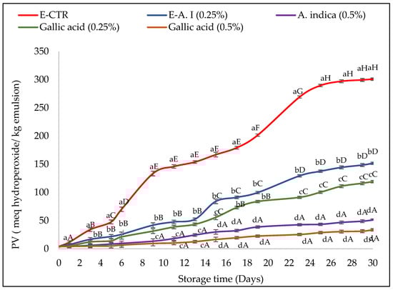 Peroxide value (PV) of emulsions incorporated with A. indica leaf 50%-aqueous EtOH extract (0.25% and 0.5%, v/v) during storage. Error bars represent the standard deviation (n = 3). Lowercase letters indicate significant differences between emulsion samples on the same day at α = 0.05, and uppercase letters indicate significant differences between the days of storage for the same sample at α = 0.05.