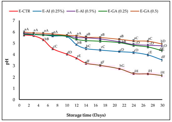 pH changes of the emulsions treated with A. indica leaf 50%-aqueous EtOH extract (0.25% and 0.5%, v/v) during storage. Error bars represent the standard deviation (n = 3). Lowercase letters indicate significant differences between emulsion samples on the same day at α = 0.05, and uppercase letters indicate significant differences between days of storage for the same emulsion sample α = 0.05.
