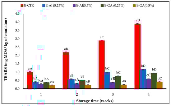 The TBARS values obtained were significantly different between emulsion samples at α = 0.05 and increased steadily during storage. After four weeks of storage, TBARS values of the E-CTR sample were higher than the values for the rest of the samples and increased rapidly from 0.97 mg MDA/kg emulsion after the first week of storage to 3.87 mg MDA/kg emulsion at the last week. The E-AG (0.25%, v/v) and E-AI (0.25%, v/v) samples presented lower TBARS values than the E-CTR sample estimated at 0.91 and 1.14 mg MDA/kg emulsion, respectively, whereas E-GA (0.5%, v/v) and E-AI (0.5%, v/v) were the most effective samples against oxidation and presented the lowest TBARS values estimated at 0.39 and 0.57 mg MDA/kg emulsion, respectively, at the last week of the storage period. Similar findings were reported by Azman et al. [52], in which an amount of 0.5% w/w G. Lutea lyophilise was able to inhibit lipid oxidation of the oil-in-water emulsion throughout storage. MDA values for emulsions treated with 0.5% gentian powder experienced below 1.2 mg MDA/kg sample over the first 21 days and showed prominently lower values than the control (emulsion without antioxidant) up to 4 weeks.