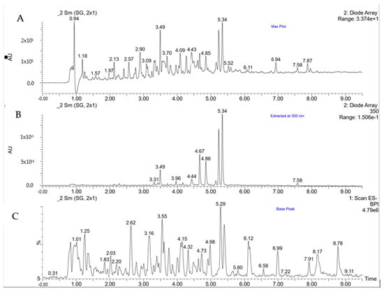 Chromatogram of buckwheat polyphenols obtained using UPLC-PDA-MS. (A)—Chromatogram UV-Vis recorded at max plot, (B)—chromatogram UV-VIS extracted at λ = 350 nm, (C)—base peak chromatogram recorded at full scan (ESI-MS).