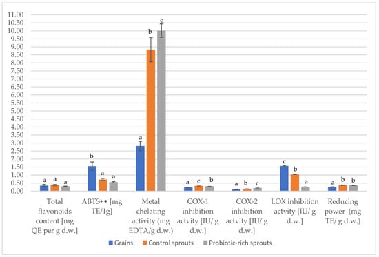 The presence of transition metal ions plays a significant role in oxidative processes leading to the formation of superoxide anion radicals and singlet oxygen during the Fenton reaction and during changes during the storage and thermal processing of food. In addition, metal ions are catalysts for the decomposition of lipid hydroperoxides. These processes can be delayed by the chelation and deactivation of iron ions present in the system [48]. Flavonoids can indirectly chelate transition metal ions, i.e., copper and iron, which prevents the formation of reactive hydroxyl radicals in cells. They also contribute to the stabilization of cell membranes [49]. The chelating capacity of metals changed similarly to the indices mentioned above. However, what distinguishes this was the increase in the activity in the digestive process. After digestion, the values were higher: 35.39 ± 1.23 mg EDTA/g d.w. in seeds, 102.15 ± 8.10 mg EDTA/g d.w. in control sprouts, and 117.78 ± 4.95 mg EDTA/g d.w. in modified sprouts. The bioavailability of the chelating capacity was highest in the probiotic-rich sprouts (Figure 2).