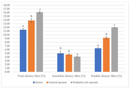 Figure 3 shows the content of total, soluble, and insoluble fiber in various forms of buckwheat. In the examined seeds and buckwheat sprouts, different amounts of dietary fiber were observed. It was found that probiotic-rich sprouts had the highest content of total dietary fiber (16.11%), while the lowest content was found in seeds (11.37%). The dominant dietary fiber fraction in probiotic-rich sprouts was soluble dietary fiber. Taking into account the level of soluble dietary fiber, the various forms of buckwheat studied can be organized as follows: probiotic-rich sprouts > control sprouts > grains. In the case of the insoluble dietary fiber fraction, probiotic rich sprouts were characterized by a statistically lower amount compared to the control sprouts and seeds.