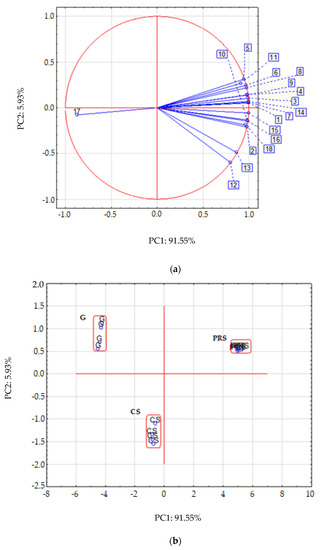 Principal components analysis (PCA) for the tested parameters (projection of variables onto the plane of factors PC1 × PC2 (a), projection of cases onto the plane of factors (b)). Abbreviations: 1. COX-1 before digestion, 2. COX-1 after digestion, 3. COX-2 before digestion, 4. COX-2 after digestion, 5. LOX before digestion, 6. LOX after digestion, 7. Total phenol compounds, 8. Total flavonoids content before digestion, 9. Total flavonoids content after digestion, 10. ABTS+• before digestion, 11. ABTS+• after digestion, 12. Metal chelating activity before digestion, 13. Metal chelating activity after digestion, 14. Reducing power before digestion, 15. Reducing power after digestion, 16. Soluble fiber, 17. Insoluble fiber, 18. Total dietary fiber.