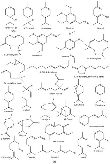 The International Organization for Standardization (ISO) defined plant-derived essential oils as products obtained from aromatic plants through specialized extraction methods without any significant change to their chemical compositions [31]. They are volatile and aromatic chemical substances, which are a mixture of fragrant and odorless compounds, mostly confined in the plant cytoplasm in the form of tiny droplets between cells and named after the plants from which they are derived [31,32].