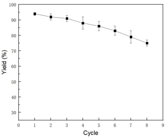 Enzyme immobilization has been found to be a solution for many enzyme limitations: it can improve enzyme stability; alter enzyme selectivity, specificity, and activity; reduce inhibitions; enlarge the operation window and resistance to chemicals; and even be coupled with enzyme purification [48,49,50,51,52,53,54,55,56,57]. In this work, the reusability of Novozym 435 was investigated; the Novozym 435 was able to be recovered by filtration easily, washed with dichloromethane, and then reused directly. Figure 1 shows that as the number of cycles increases, the yield of 3a decreases; it obtained a 79% yield even after seven cycles. The decrease in the yield of 3a might be due to the leakage of proteins from the support and the slight dissolution of the support during the reaction cycles (Table S1).