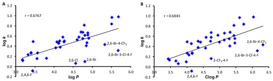 Comparison of experimentally found log k values of ring-substituted N-arylcinnamanilides 1–37 with log P calculated using ACD/Percepta (A) and Clog P calculated using ChemBio DrawUltra (B).