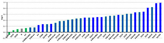 Order of individual derivatives arranged according to increasing log k values. (Grey = unsubstituted 1, green = ortho-substituted derivatives, blue = meta/para-substituted derivatives, green/blue hatched = derivatives with meta/para- and ortho-substitutions.)
