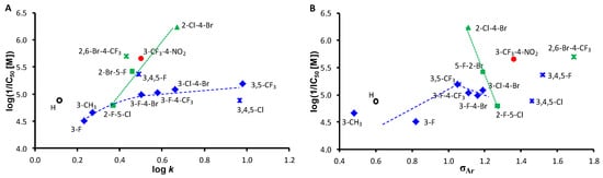 The second correlation, a linear and steeply increasing trend, can be found for the compounds substituted in ortho positions, i.e., C(2,5)′ and C(2,4)′. The activity increases from log k = 0.36 (comp. 19, R = 2-F-5-Cl) to the most potent derivative 23 (log k = 0.67). The simultaneous substitution of the para- and ortho-substitution seems to be highly important, e.g., compound 14 (R = 2,6-Br) expressed an IC50 > 35 µM compared to compound 36 (R = 2,6-Br-4-CF3) with an IC50 = 2.0 µM. The activity of derivative 18 (R = 3-CF3-4-NO2) is specific and must be attributed only to this combination, because compound 17, where the CF3 group is shifted to the C(2)′ position, already demonstrated only IC50 > 35 µM, similar to the combination R = 2-OCH3-5-NO2 (16).