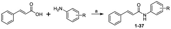 Synthesis of (2E)-N-aryl-3-phenylprop-2-enamides 1–37. Reagents and conditions: (a) PCl3, chlorobenzene, MW, 20 min for 1–7, 9–12, 14–16, 20, 22, 23, 28 [22,33], or 30 min for 8, 13, 17–19, 21, 24–27, 29–37 [23].