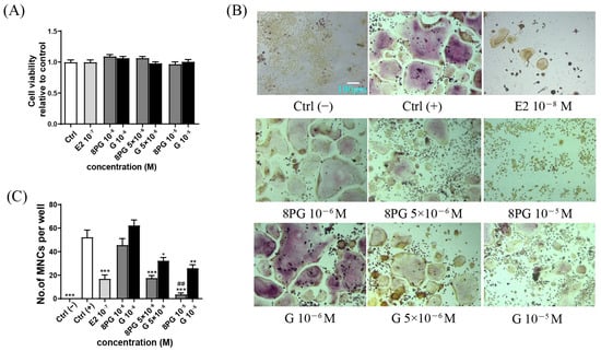 The effects of 8PG and genistein (G) on morphological changes in TRAP-positive RAW264.7 cells induced by RANKL for 4 days. (A) Evaluation of the cytotoxic effects of 8PG and G in RAW 264.7 pre-osteoclastic cells without RANKL induced by CCK-8 assay. (B) TRAP staining photographs captured under light microscope. C (−) represents control group was treated with only 1% ethanol; C (+) represents control group in which cells were induced with 1% ethanol, 100 ng/mL RANKL and 30 ng/mL M-CSF; scale bars: 200 μm. (C) Number of TRAP-positive multi-nucleated cells (MNCs) were counted as osteoclast cells (>3 nucleus); E2: 10−8 M, 17-β estradiol, as a positive control; data are means ± SEM (n = 3). * p < 0.05, ** p < 0.01, *** p < 0.001 versus C (+); ## p < 0.01 vs. genistein (G)-treated group at the same tested concentrations.