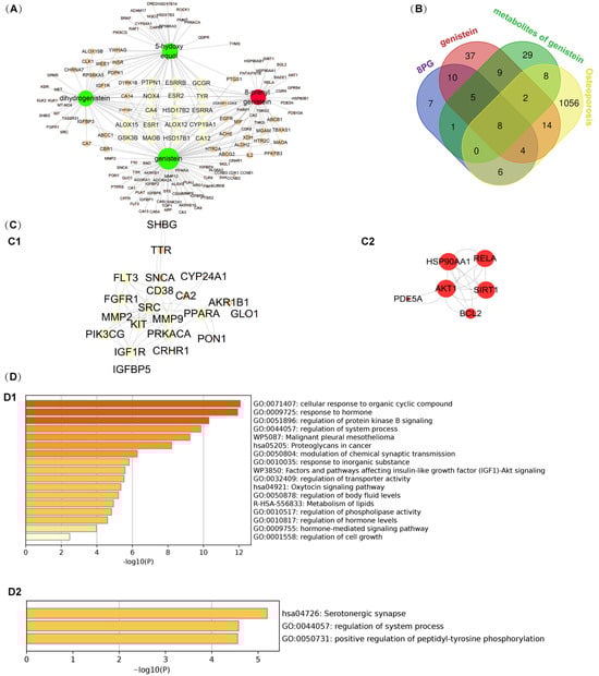 The predicted targets and pharmacological information of 8PG and genistein. (A) Compound-target network of 8PG, genistein, dihydrogenistein, and 5-hydoxy equol. (B) The overlapping targets between osteoporosis-related targets and the targets of 8PG, genistein, dihydrogenistein, and 5-hydoxy equol. (C) The protein–protein interactions among the overlapped targets, including genistein and its metabolites (C1) and 8PG (C2). (D) The enriched terms across input genes, including genistein and its metabolites (D1) and 8PG (D2).