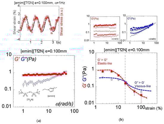 (a): Top: in-phase (input) shear strain and (output) shear stress waves at 1 Hz frequency and 2% shear strain by a 100 µm layer of [emim][Tf2N] (1-Ethyl-3-methylimidazolium bis(trifluoromethylsulfonyl)imide). Bottom: The frequency dependence of the viscoelastic moduli indicate a low-frequency elastic-like presence, with the shear modulus G′ being higher than the viscous modulus G″ up to 20 rad/s. Measurements carried out at 100 µm gap thickness, γ = 2% strain amplitude, room temperature and total wetting conditions (Alumina). (b): Top: frequency dependence of the viscoelastic moduli (G′, G″) displayed by the ionic liquid [emim][Tf2N] at 100 µm gap thickness and different strain amplitudes. Bottom: Shear strain-induced transition from elastic-like to viscous-like. The shear modulus G′ higher than the viscous modulus G″ progressively vanishes with increasing strain. Measurements carried out at 2 rad/s, at room temperature using total wetting boundary conditions (alumina). The vertical dashed line indicates the separation line between the elastic and the viscous regimes. The continuous lines are eye guides.
