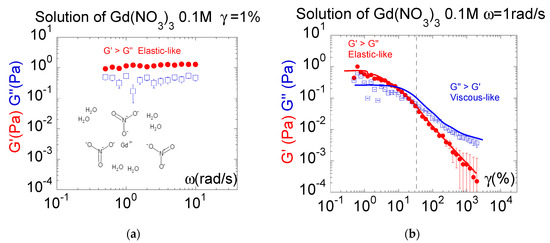 The same dynamic mechanical approach is used for paramagnetic liquids. Figure 3 displays the shear stress exhibited by a 0.1 M solution of Gadolinium(III) nitrate (Gd(NO3)3), which displays paramagnetic properties at room temperature. We carried out measurements at a relatively large gap thickness (430 µm) to fit with the order of magnitude of the scattering measurements (the mesoscopic shear elasticity decreases as the scale increases [2,7,8]). The dynamic spectrum (Figure 3a) shows that the elastic component is larger than the viscous component, both exhibiting a relative independence with respect to the frequency within a range of 0.4 rad/s to 10 rad/s. The paramagnetic liquid exhibits, in nearly static conditions (1% shear strain), an elastic behavior. This elastic behavior is, however, very fragile. Figure 3b illustrates the evolution of the elastic-like behavior as a function of the strain amplitude. The shear elasticity is progressively lost over 10% shear strain, highlighting the need to stay close to equilibrium conditions (weak shear strain and low thickness) to probe the elastic-like response. Similarly to the ionic liquid [emim][Tf2N], the large-strain plastic behavior makes the viscous regime appear. Since the viscous behavior is obtained at large strain amplitudes, it is the strain-induced product of the initial shear elasticity.