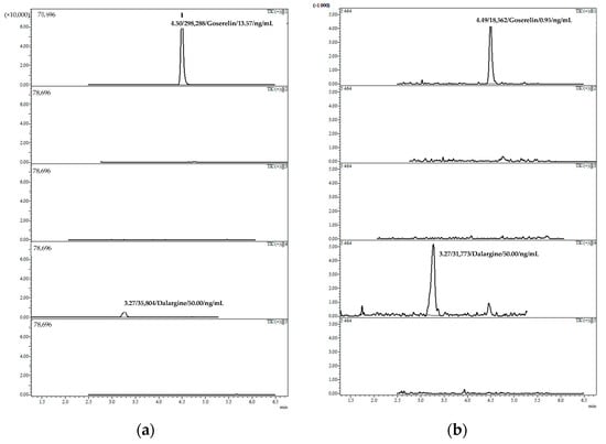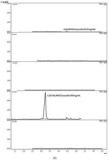 The developed method for anti-cancer peptide-based therapeutics blood plasma quantitation was successfully applied to therapeutic monitoring in patients with prostate cancer. The patients received goserelin, triptorelin, or buserelin drugs at different stages of the therapy. The findings are presented in Table 4. Chromatograms of the patients’ plasma samples are presented in Figure 2.
